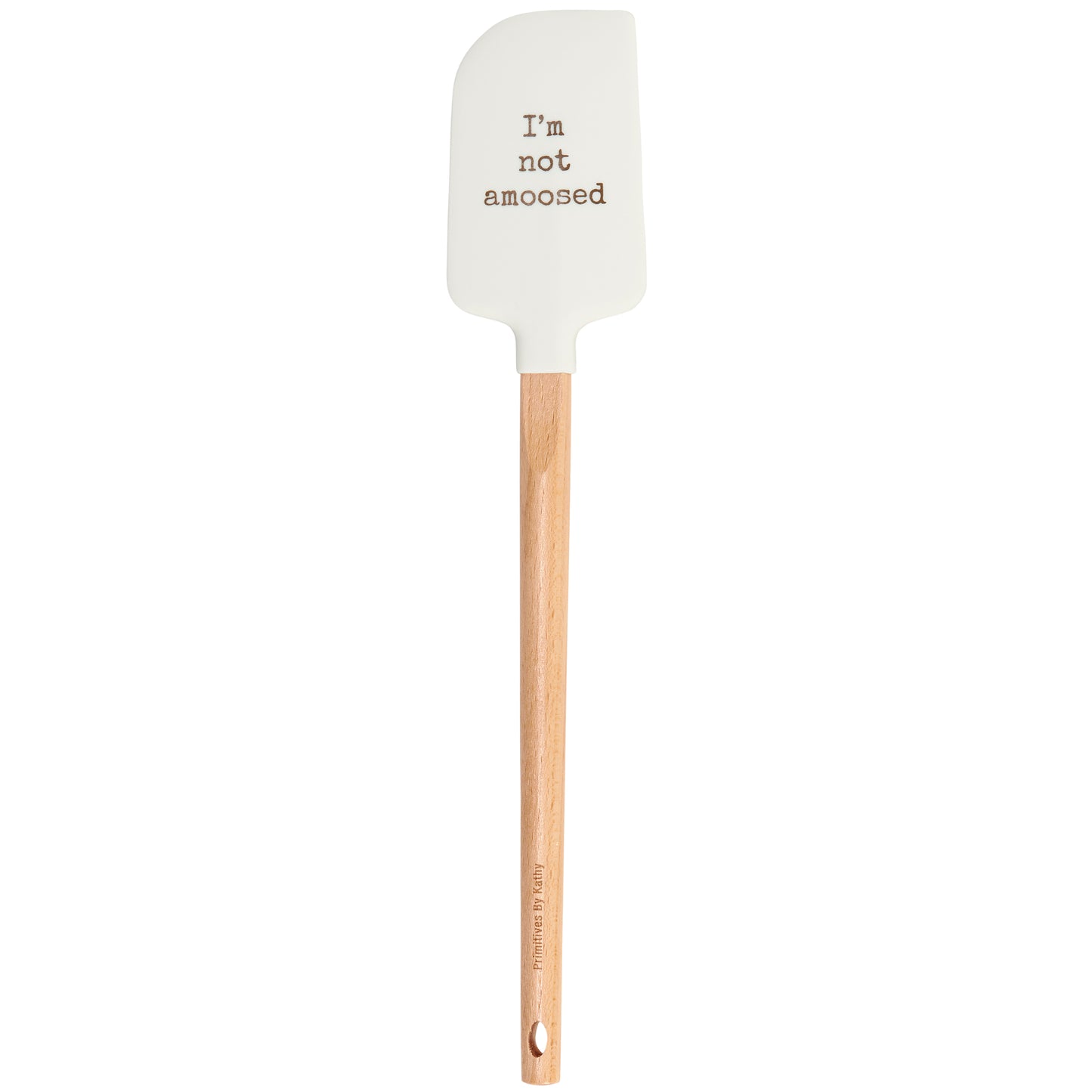 A double-sided silicone spatula displaying vintage art of a moose on one side and punny sentiment on the other side that reads "I'm Not Amoosed."