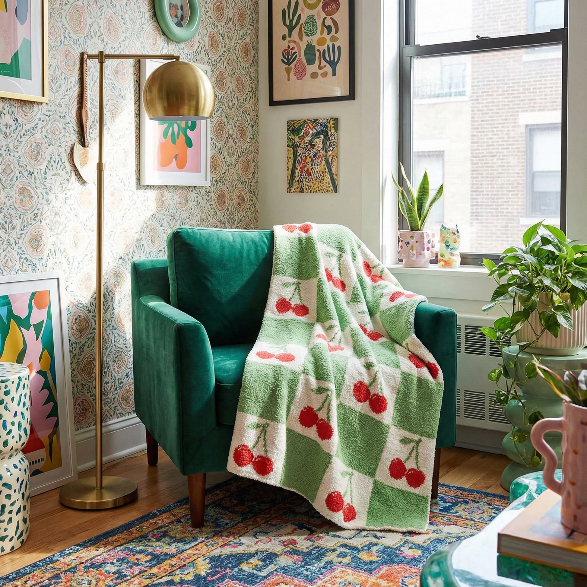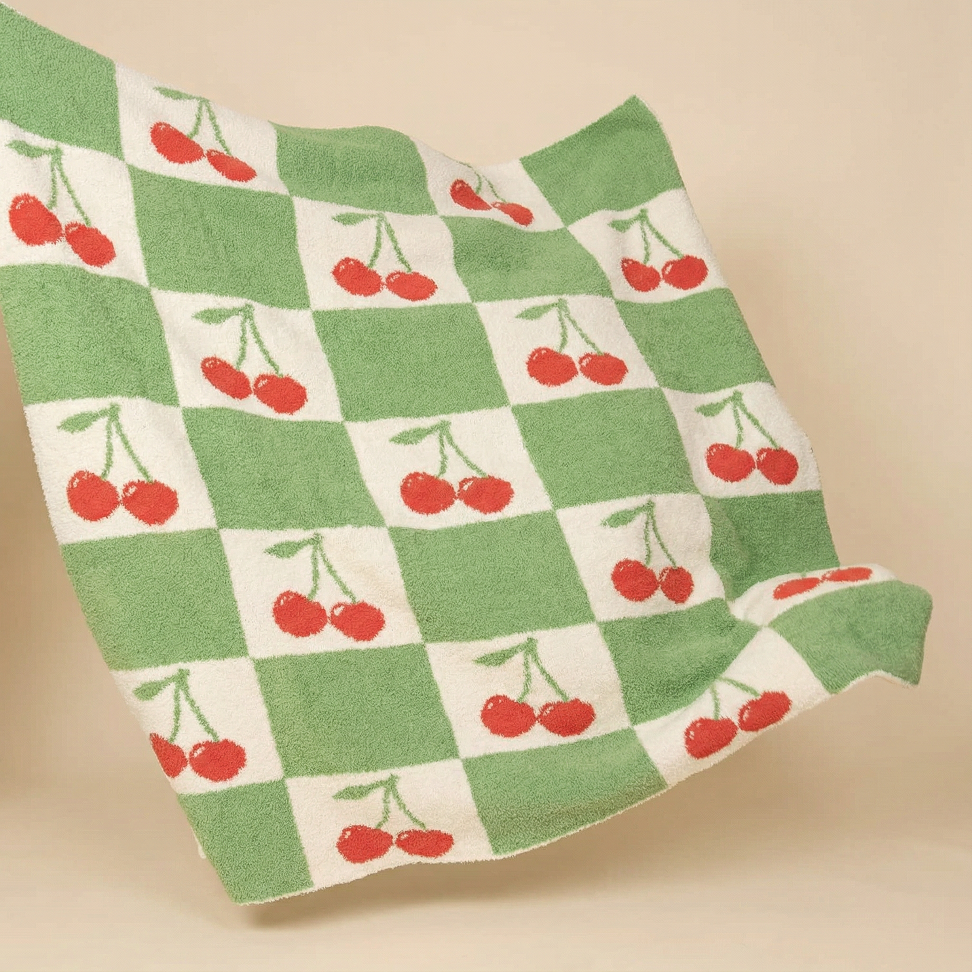 Add a playful pop of retro charm to your space with the Miss Sparkling Cherry Check Knitted Blanket Throw. Designed in-house, this cozy 50” x 60” knit features a bold green-and-white checkerboard pattern with cherry intarsia design throughout. Thick and comfy, it’s perfect for snuggling on the couch, layering on your bed, or styling as a statement throw in your living space. A true blend of comfort and design, this piece captures Miss Sparkling’s signature retro-inspired knitwear aesthetic.