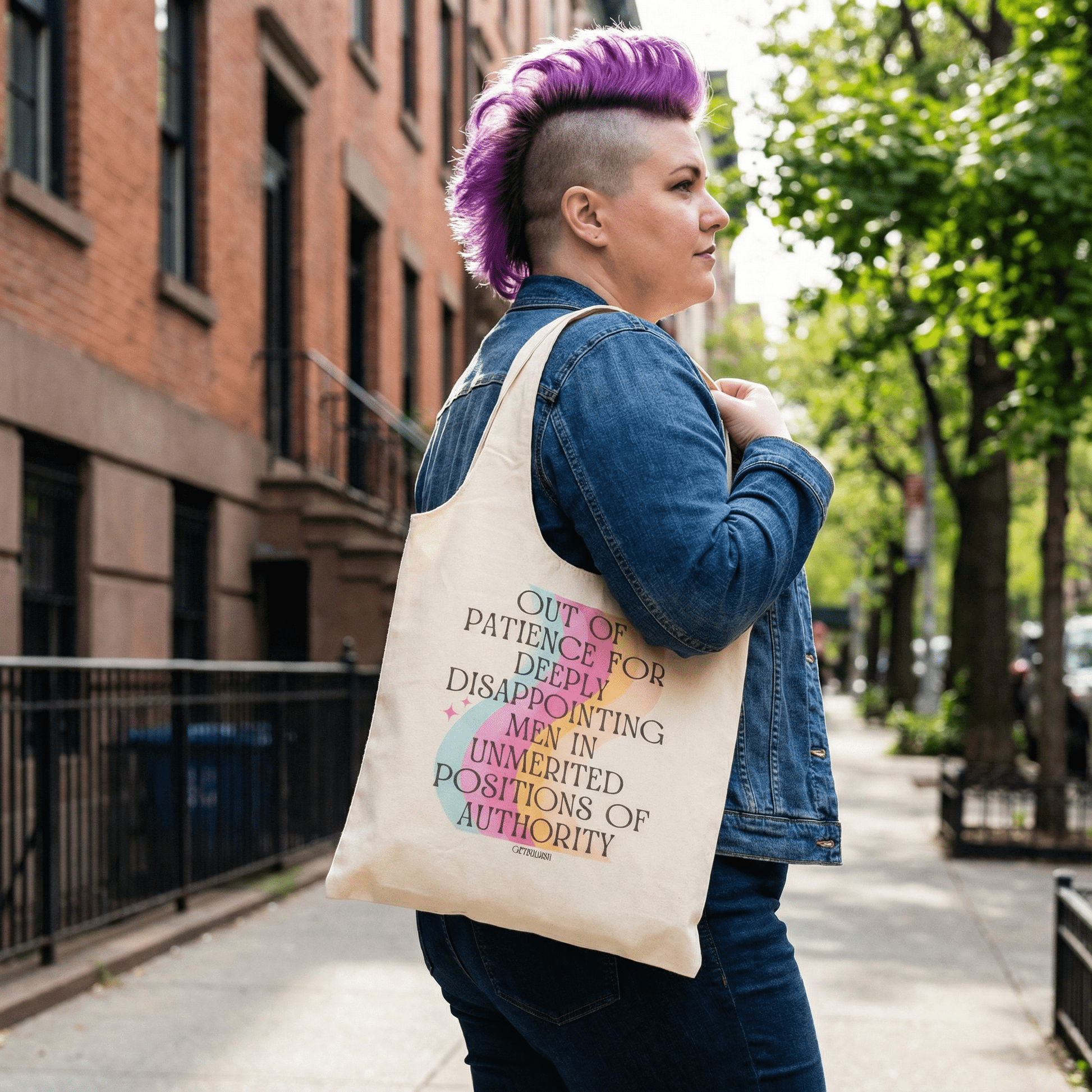 When it comes to men in unmerited positions of authority, you’re 👎 OUT OF PATIENCE! Show it with this slouchy tote bag that'll definitely get some second looks.