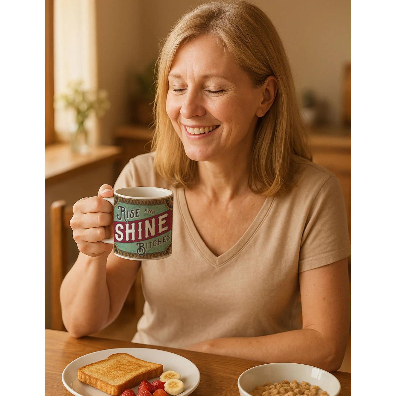 Get your day in gear with the 'Rise and Shine Bitches' mug!