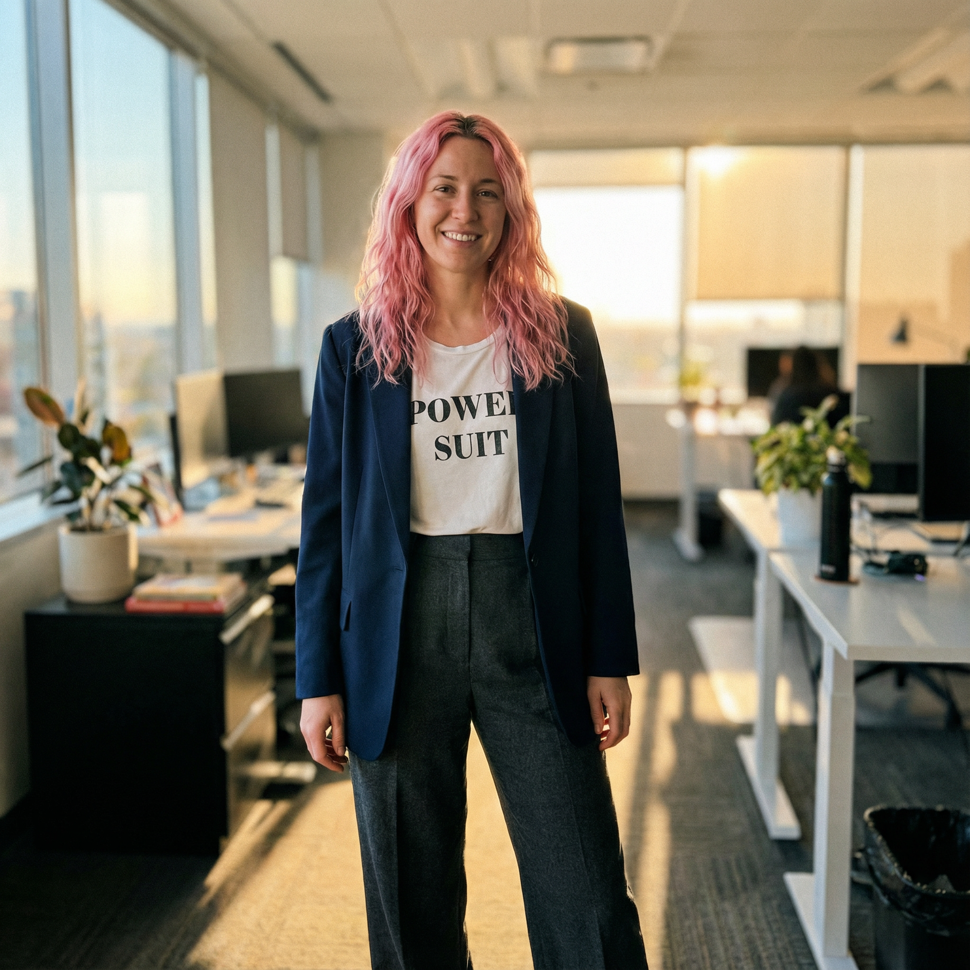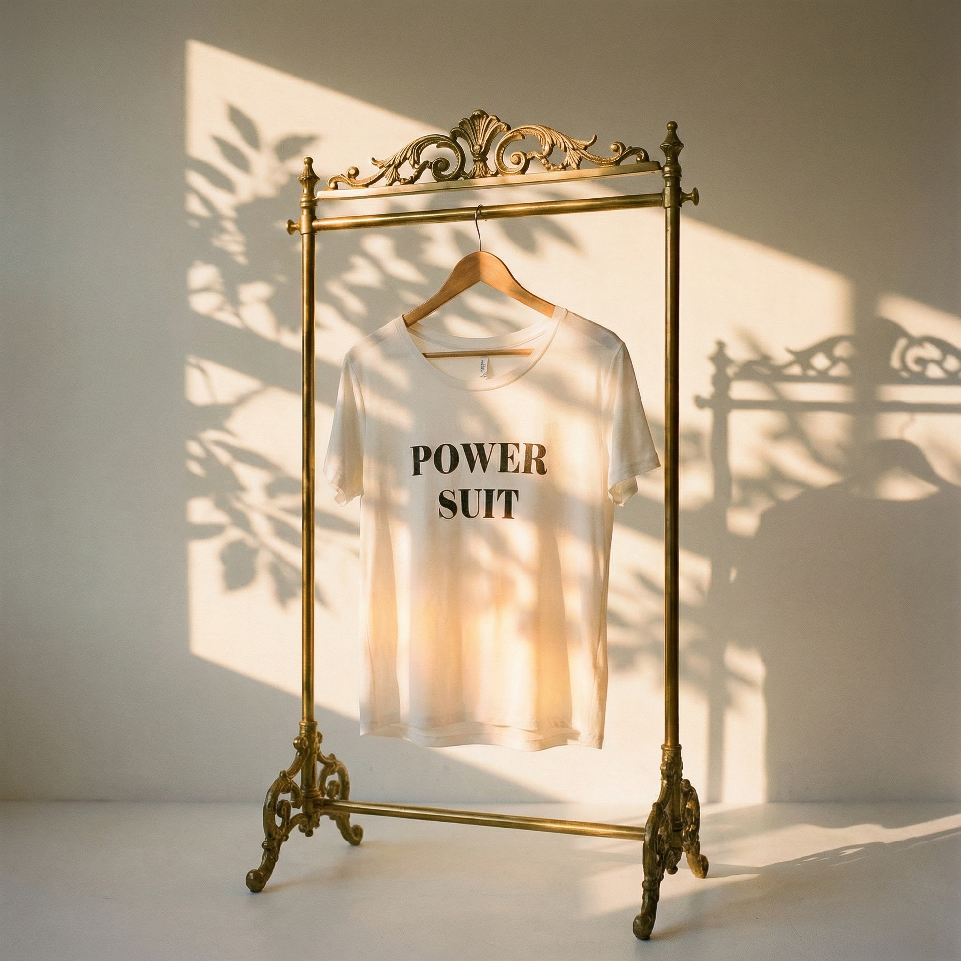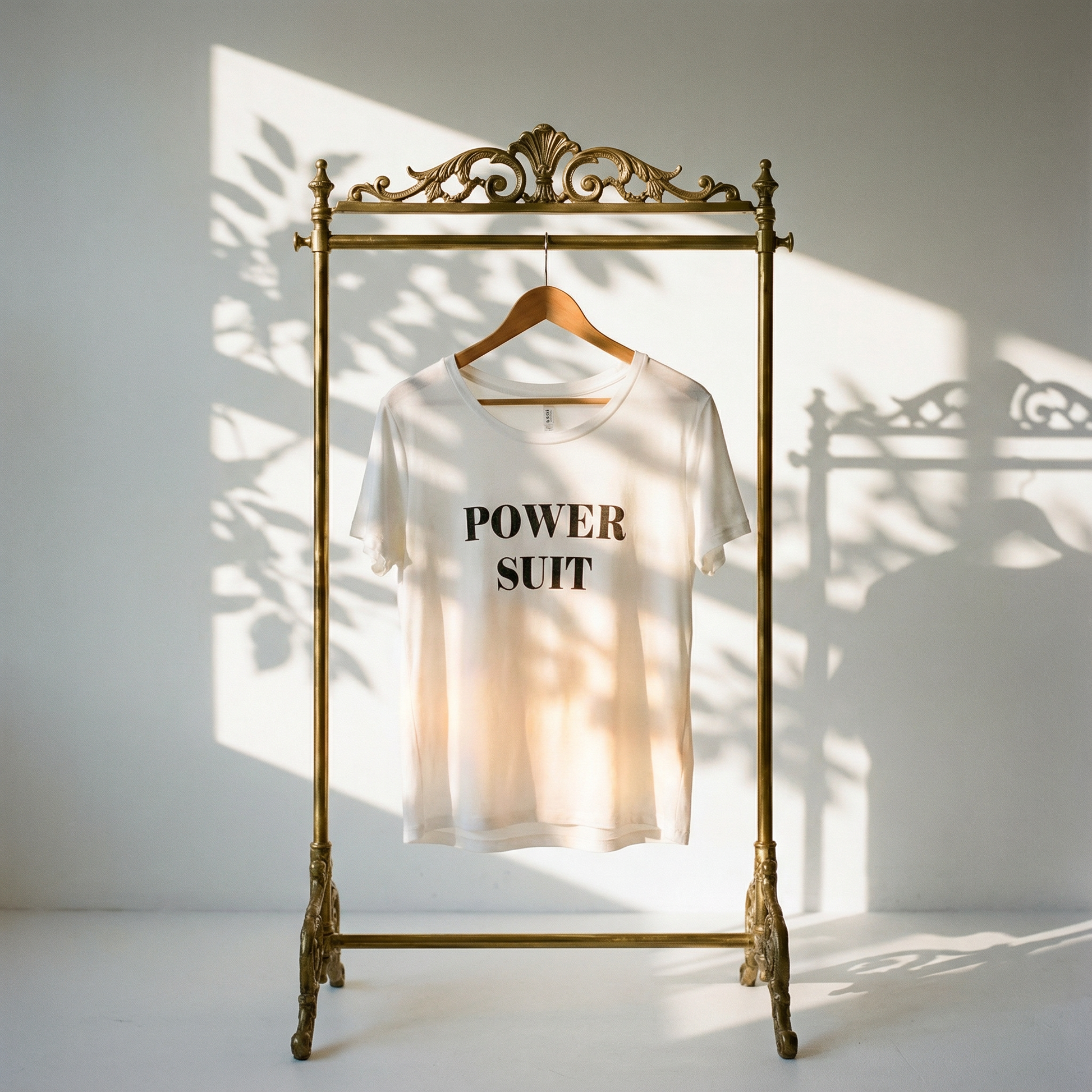 A soft white tee that reads "Power Suit." For all those days that the power suit was within you all along.