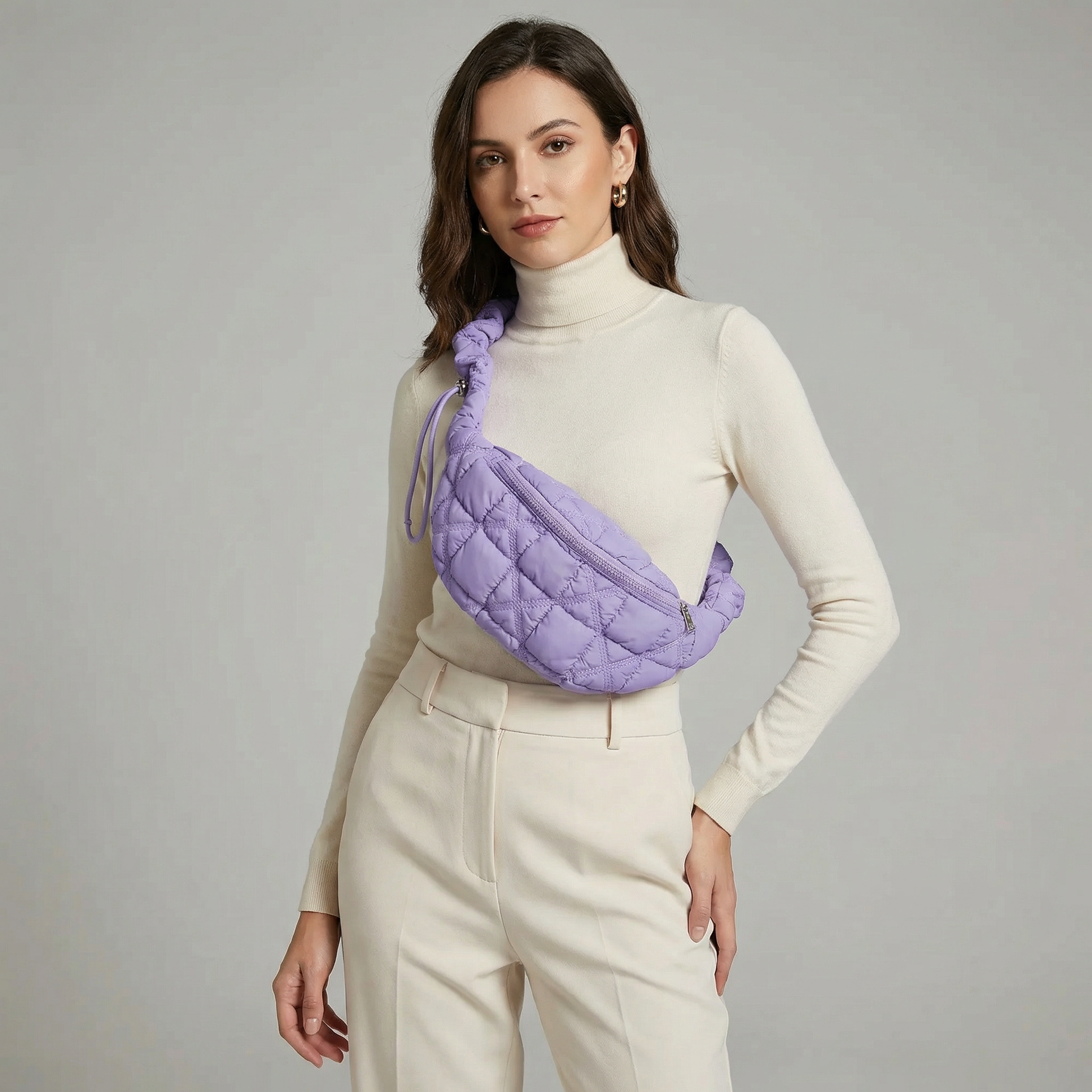Carry your essentials in style with our Quilted Puffer Crossbody Bag in vibrant purple. This adjustable fanny pack is perfect for on-the-go convenience, featuring a generous size for your phone, keys, wallet, and makeup essentials. Makes a thoughtful gift for the fashion-forward individual in your life.