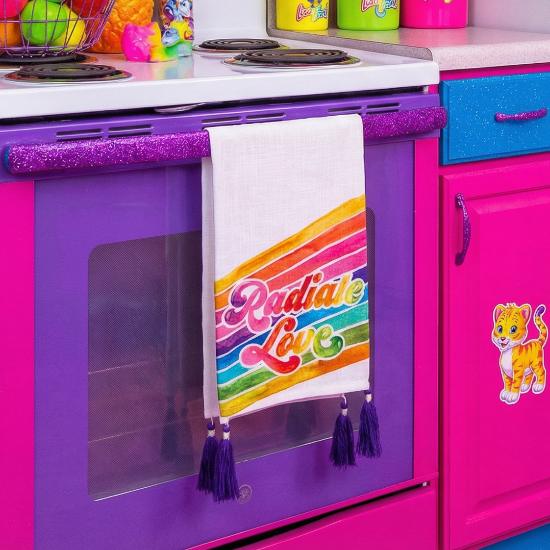 A cotton watercolor art kitchen towel featuring a retro-inspired "Radiate Love" sentiment, rainbow design, and corner tassel trim details.