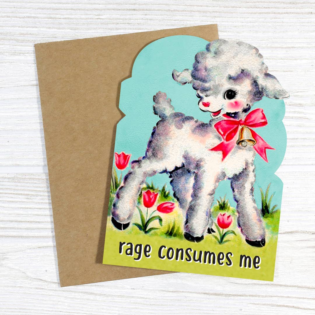 A delightfully offbeat greeting card that pairs the deadpan line "Rage consumes me" with an adorable vintage lamb illustration.