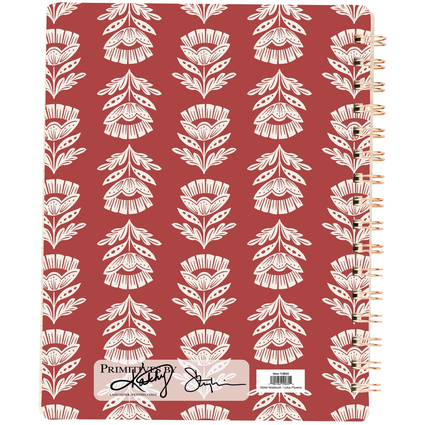 Back cover features coordinating red floral pattern. Red Folk Floral spiral notebook includes 120 lined pages.