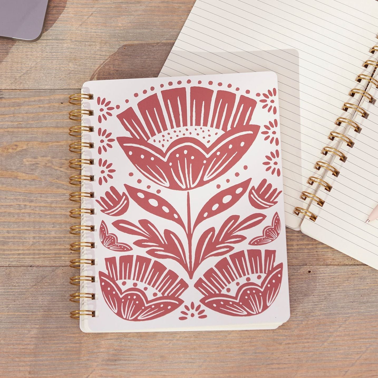 A double-sided spiral notebook displaying a calming hand illustrated design of red florals inspired by Scandinavian folk art.