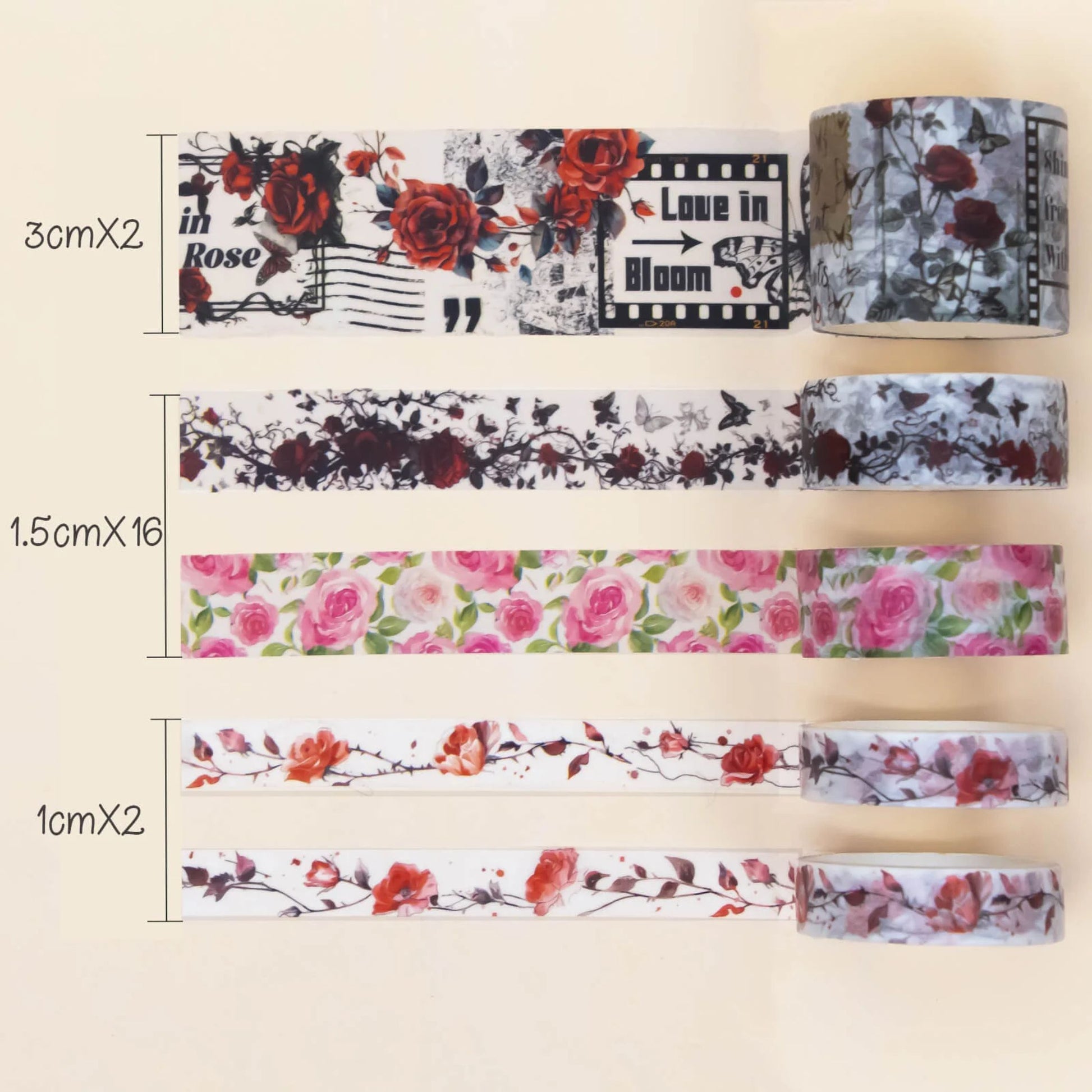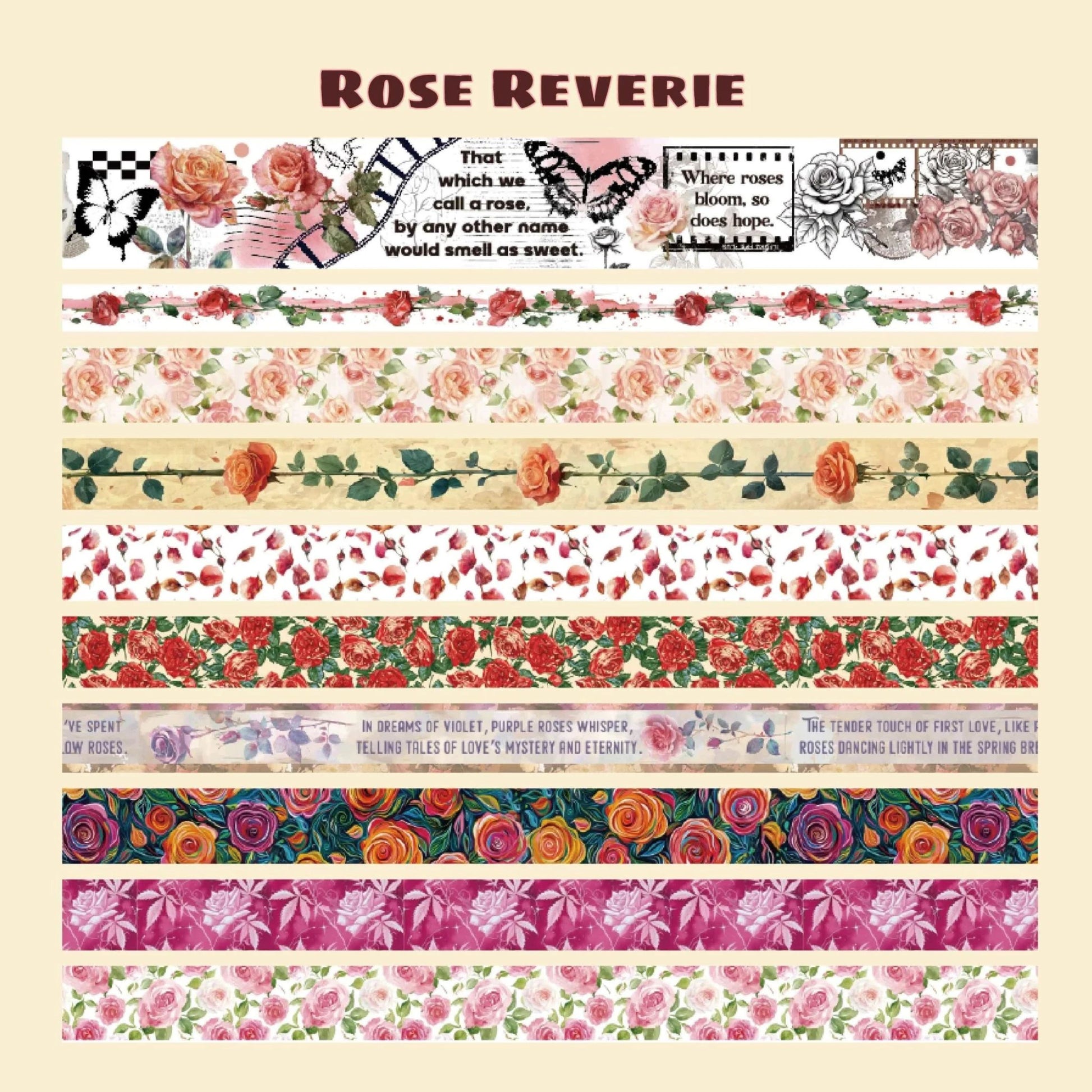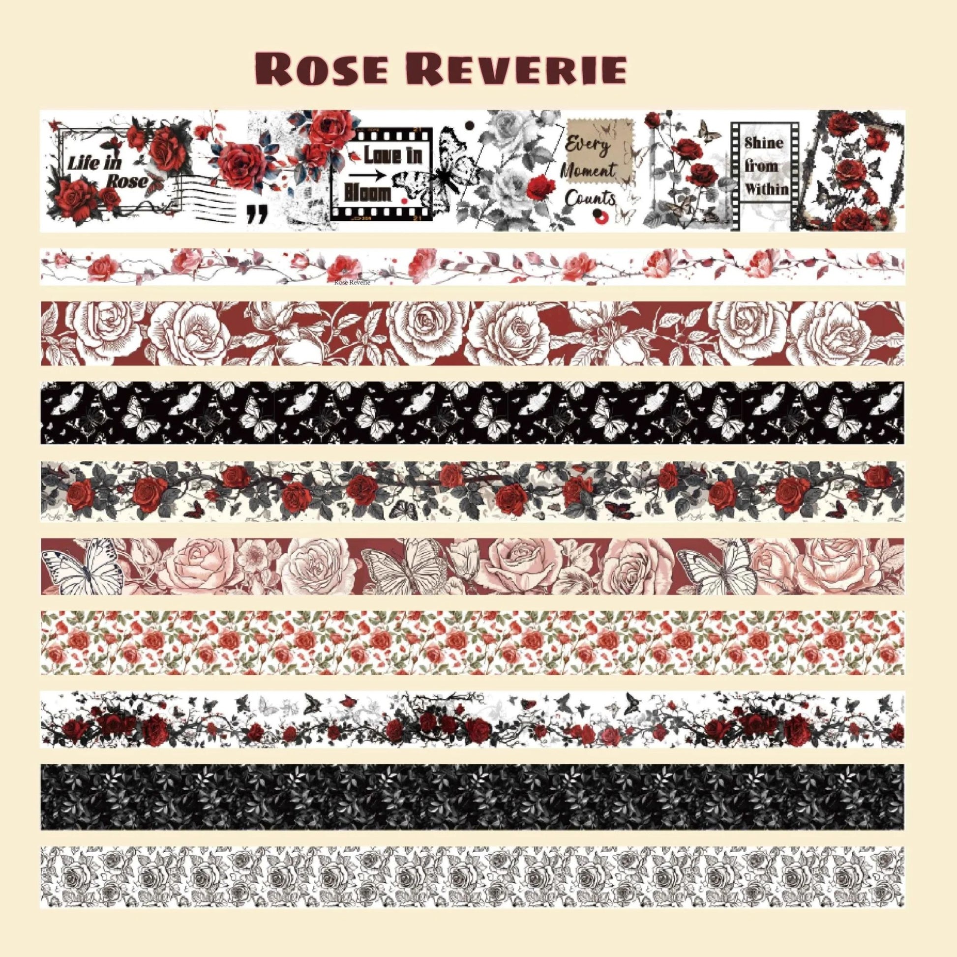Featuring elegant rose patterns, delicate botanical accents, vintage-inspired florals, and soft romantic tones, this coordinated set blends classic charm with modern creativity. Whether you’re layering borders in a bullet journal or adding finishing touches to gift wrap, these tapes bring graceful floral beauty to every page.
