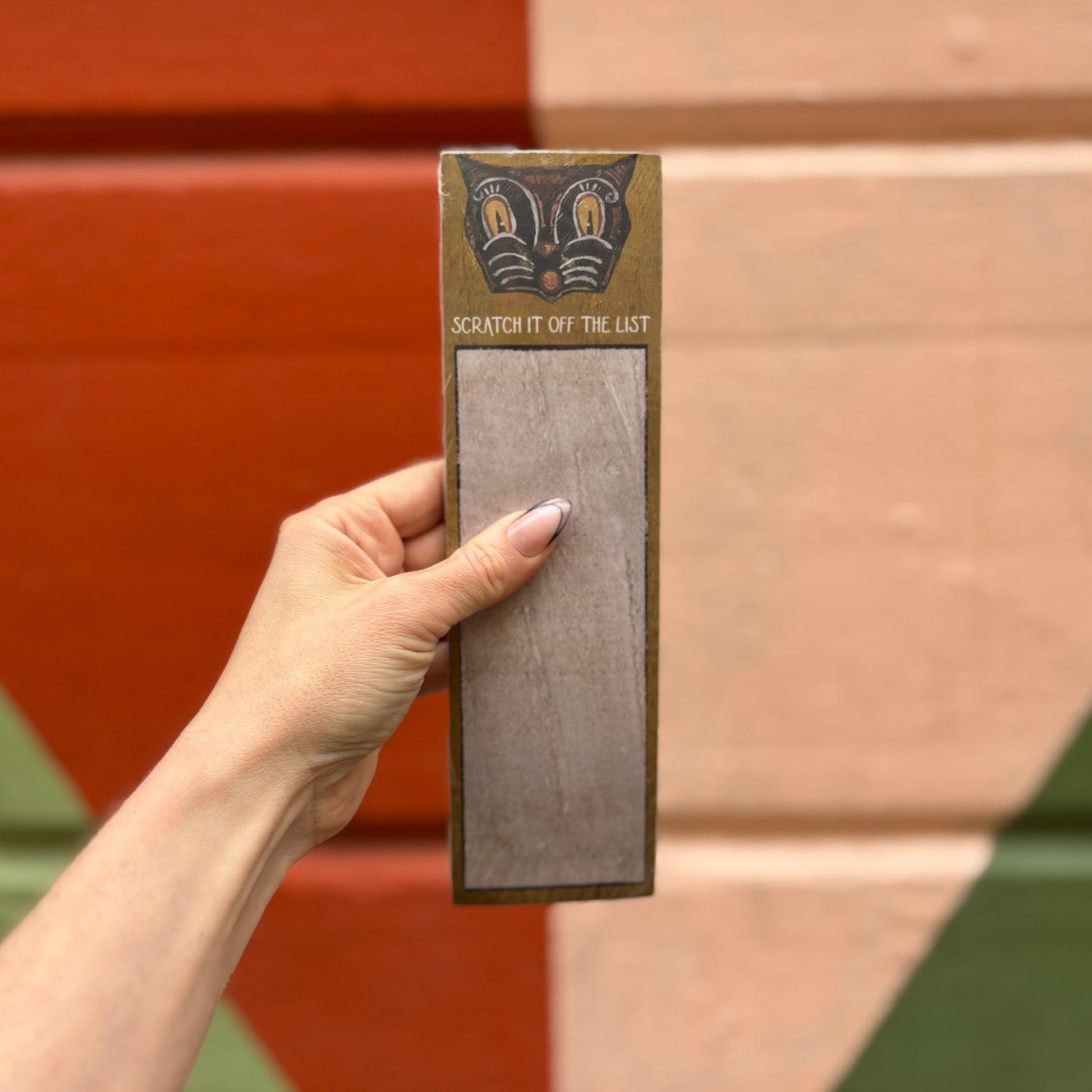A list notepad displaying a primitive inspired black cat face and fun seasonal sentiment that reads "Scratch It Off The List" with a decorative space underneath for writing.