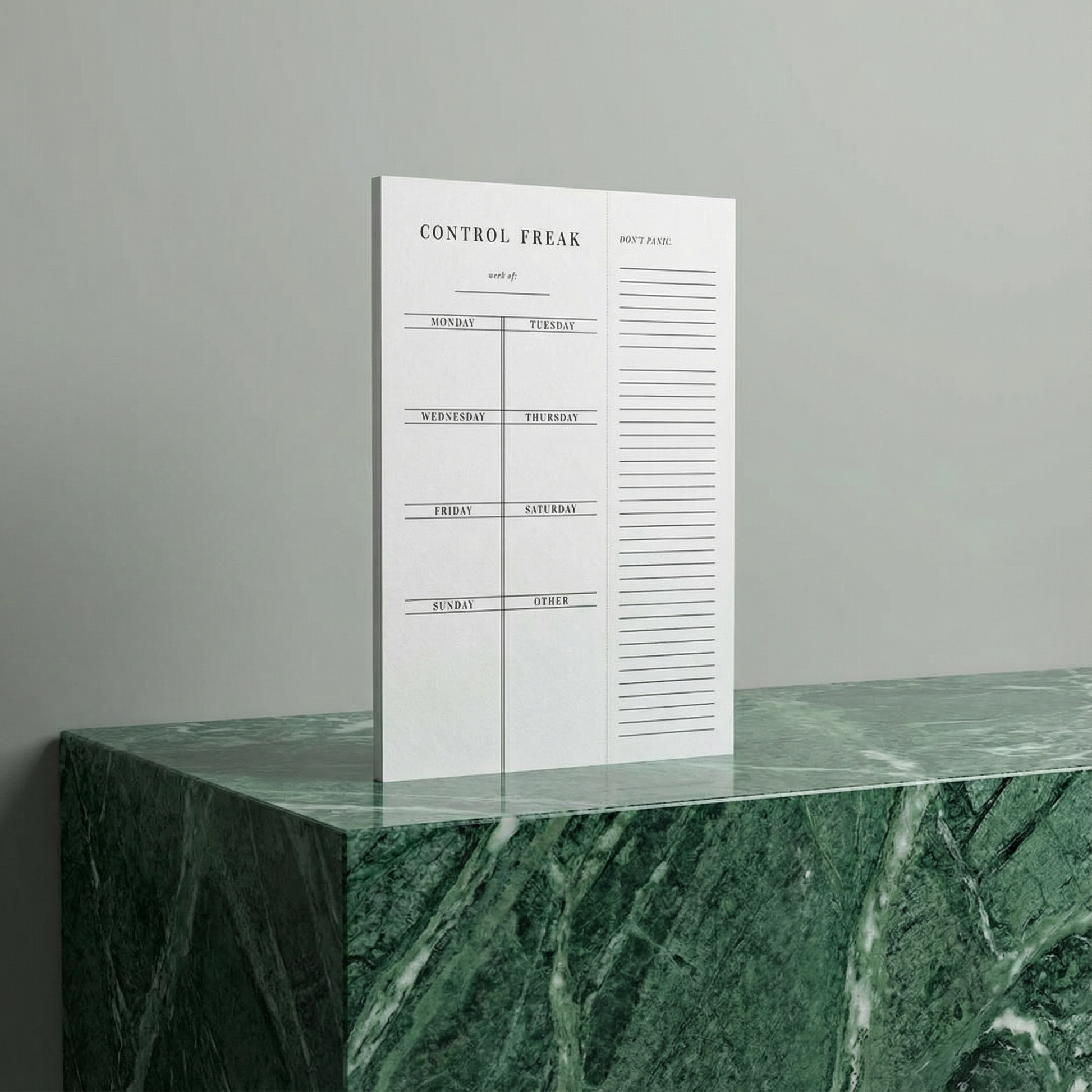 - Title reads "Control Freak" with sections for each day on the week - Monday through Sunday and a separate section lined for notes, lists and more