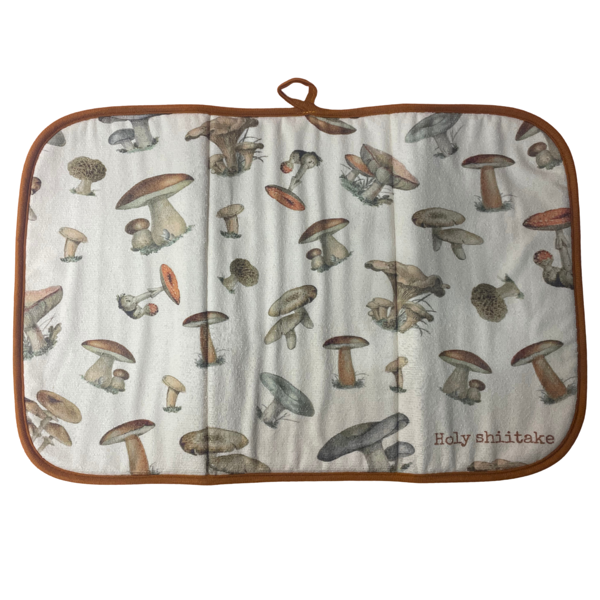 An ultra-absorbent drying mat displaying vintage art of wild mushrooms with a coordinating mushroom-themed pun that reads "Holy Shiitake."