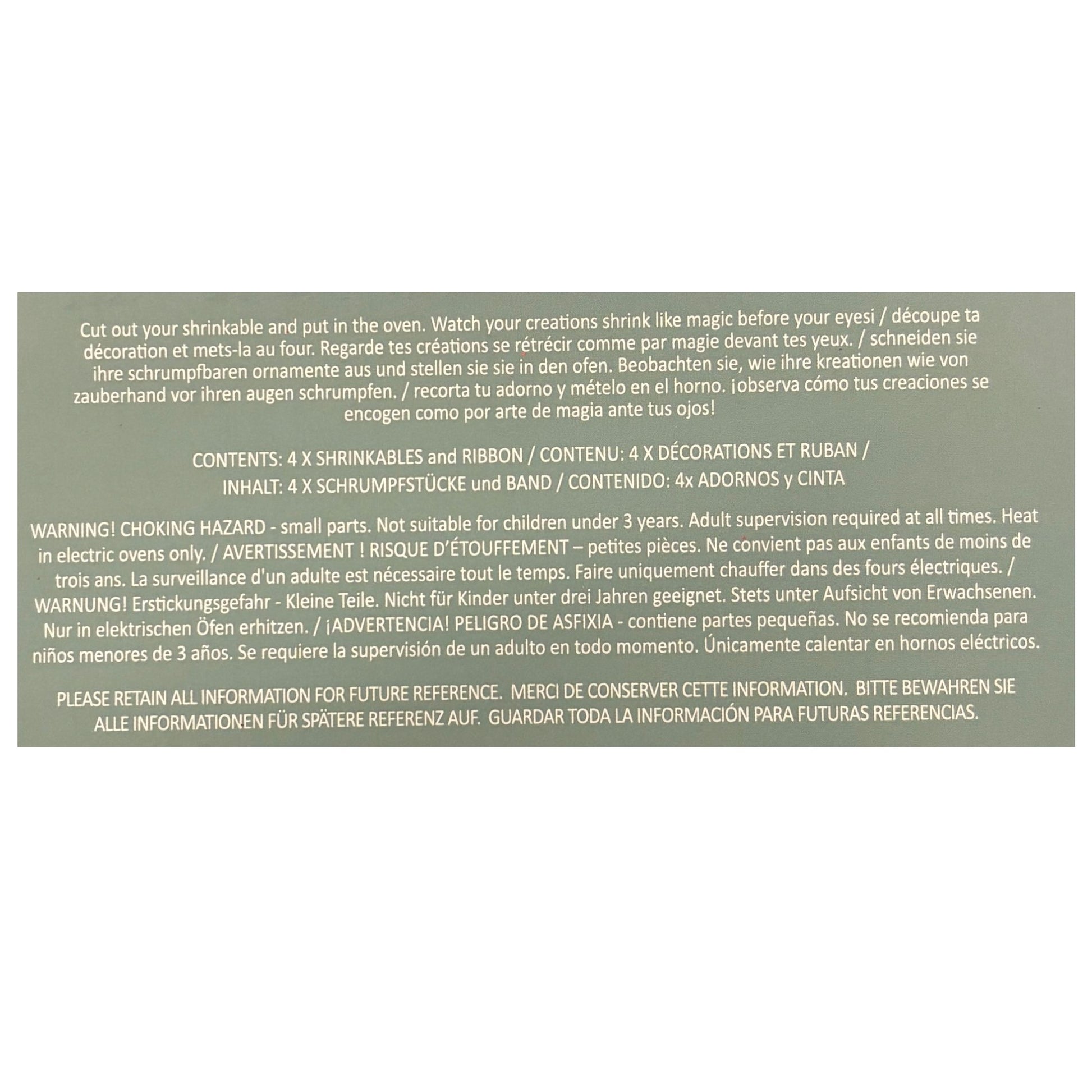 This kit includes fun holiday designs that will shrink before your eyes in the oven! Includes 4 designs and ribbon.