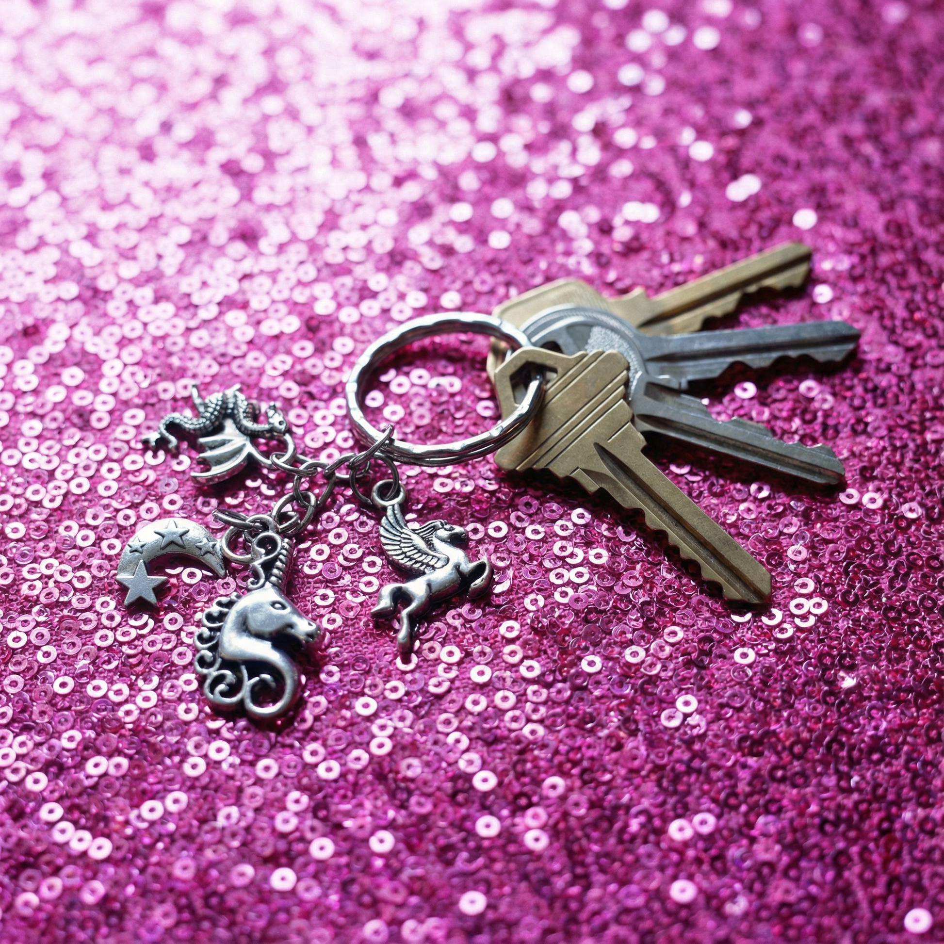 Bring a touch of whimsy wherever you go with this Unicorn Fantasy Charms Keychain. Featuring a collection of mini fantasy-themed charms—including a unicorn, moon, stars and other magical motifs—each approx. 0.75" tall, this 3" keychain is full of charm (literally). The perfect everyday accessory for dreamers and fantasy lovers alike.
