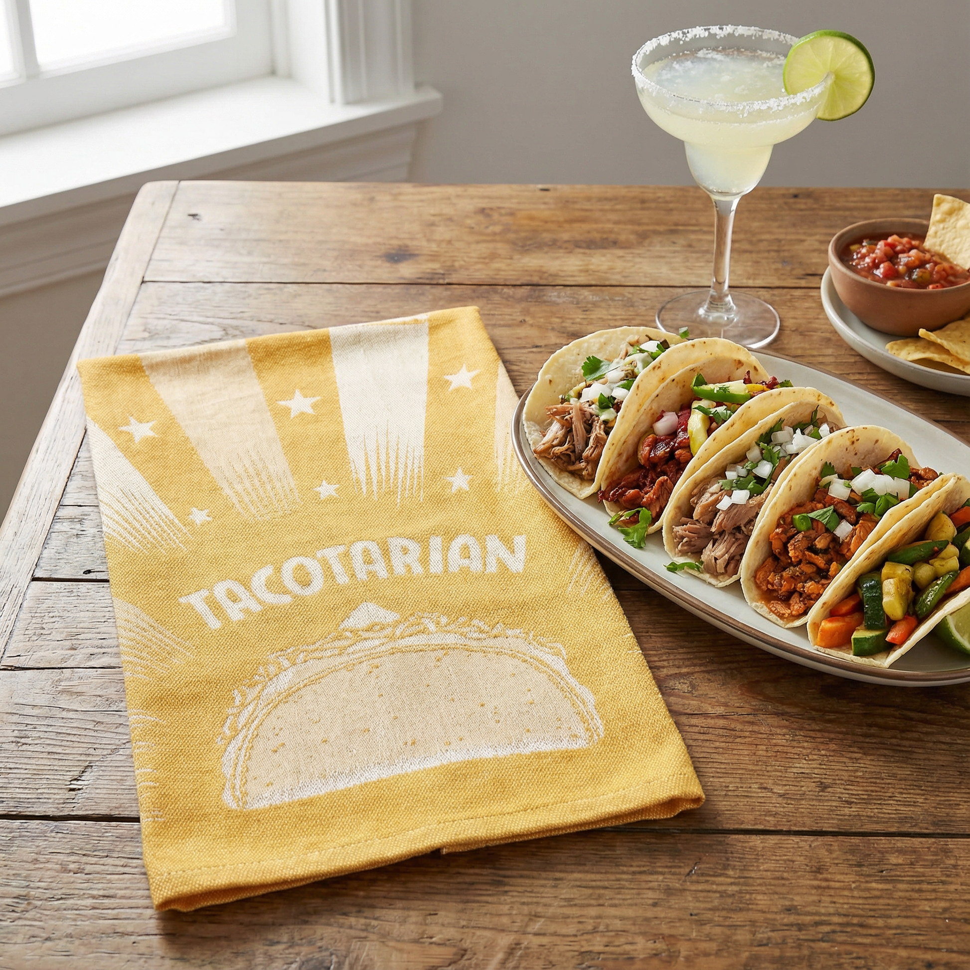 This is a jacquard woven cotton dish towel featuring a taco and stars design with "Tacotarian" sentiment.