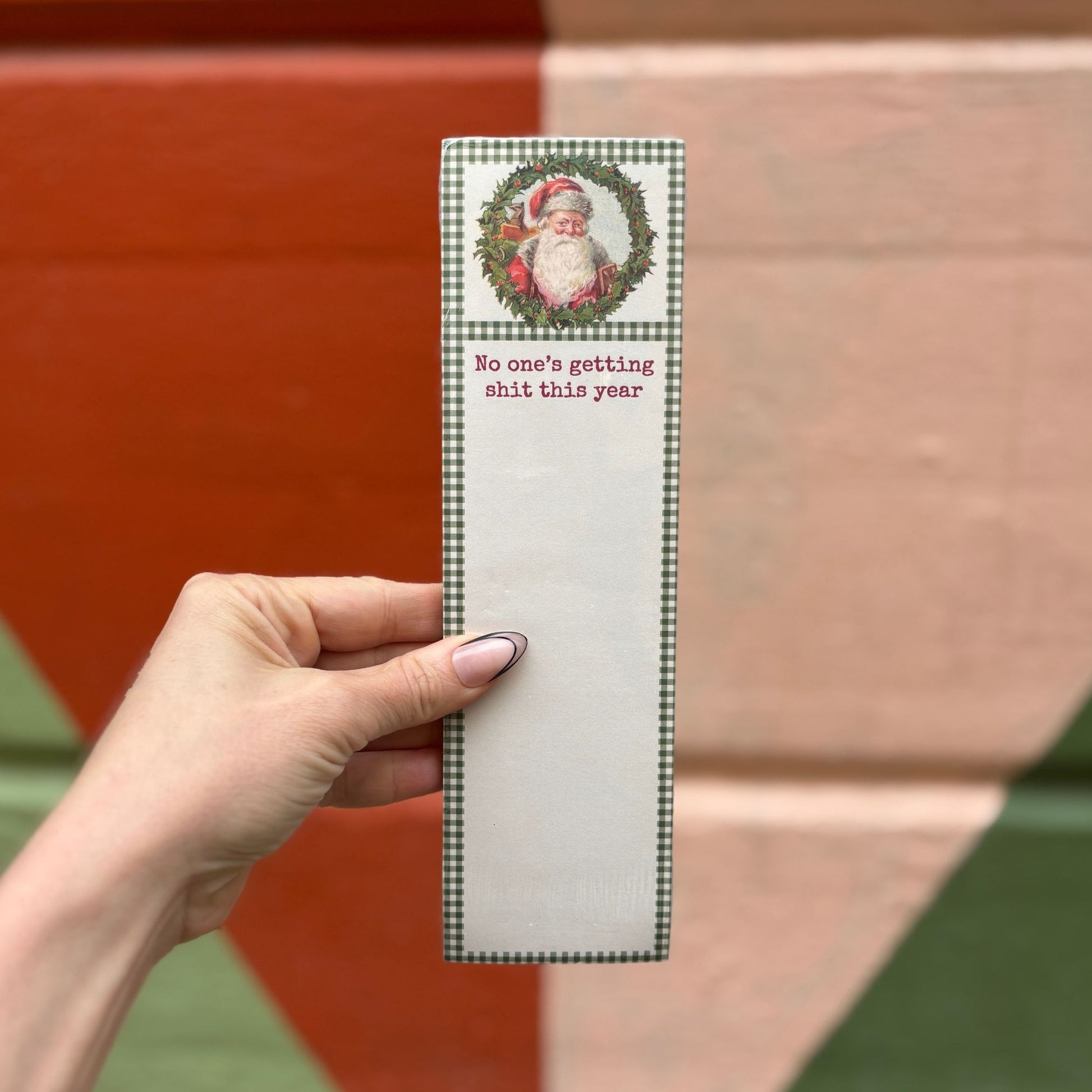 A list notepad displaying a vintage design of a Santa in a wreath with green gingham pattern around writing space and a fun Christmas inspired sentiment that reads "No One's Getting Shit This Year."
