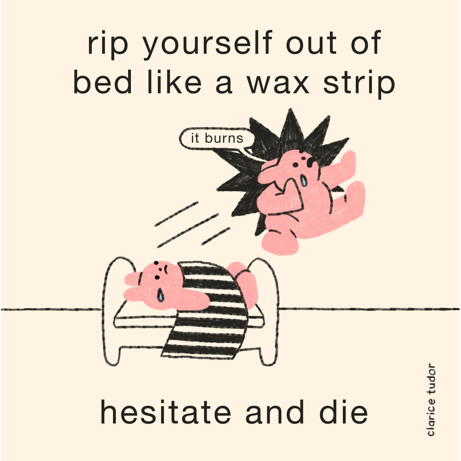 For those mornings when motivation is nonexistent and the snooze button is winning, here’s your new rallying cry: Rip Yourself Out of Bed Like a Wax Strip. This delightfully dramatic comic print serves as a brutal yet oddly inspiring start-of-day mantra.