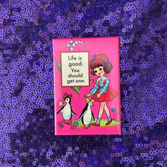Life Is Good, You Should Get One Fridge Magnet with Retro Illustrated Girl and Penguins
