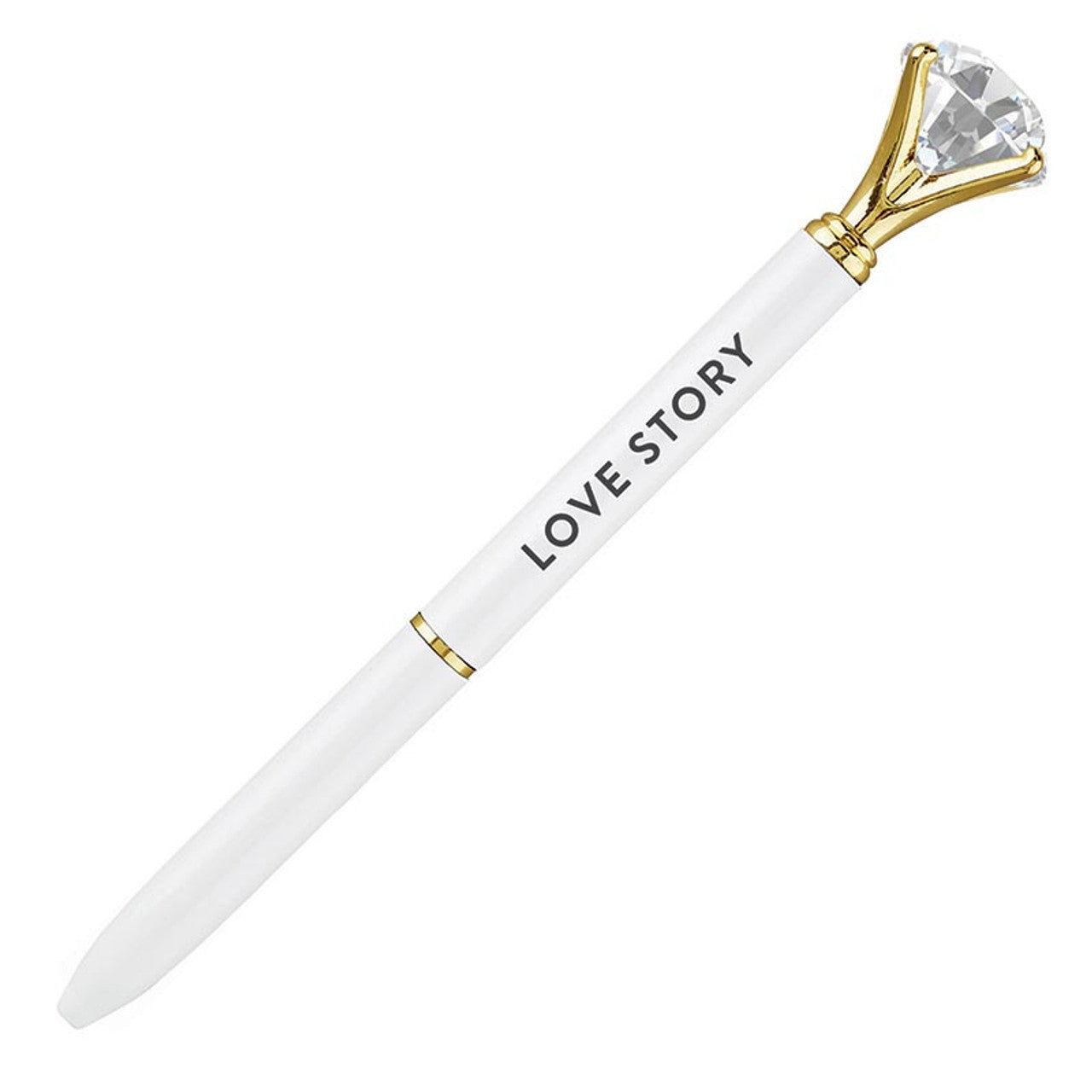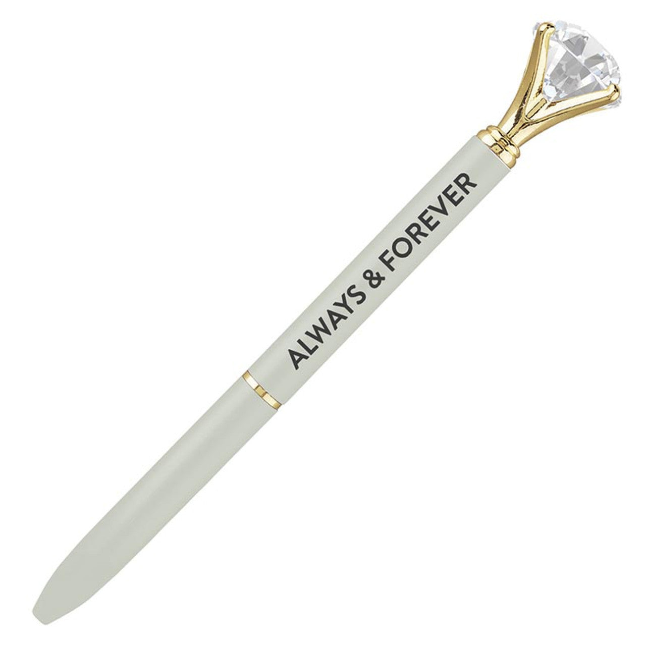 - Metal barrel ballpoint pen with large acrylic diamond-style gem topper