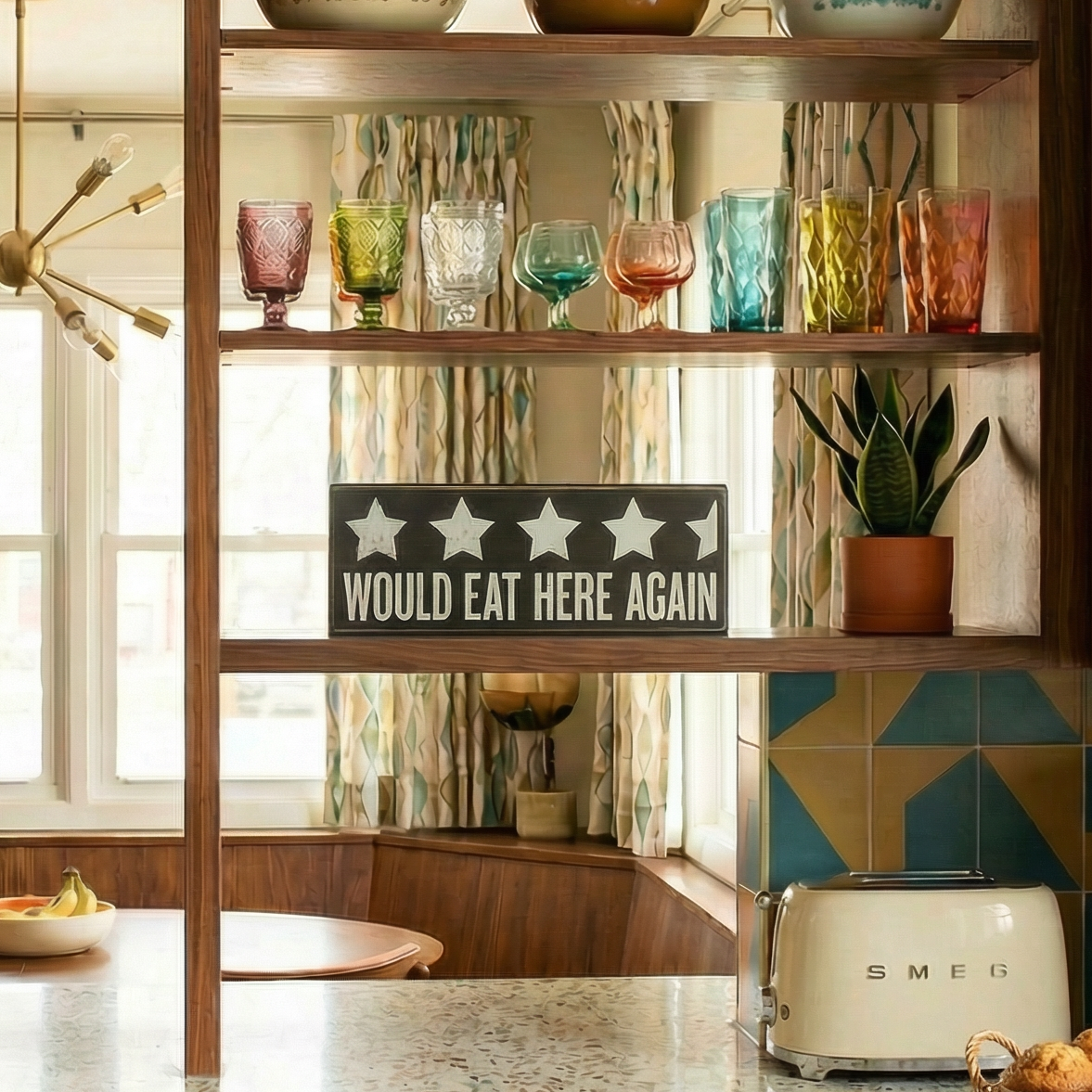 A classic black and white box sign reading "Would Eat Here Again" with a 4.5 star rating design.