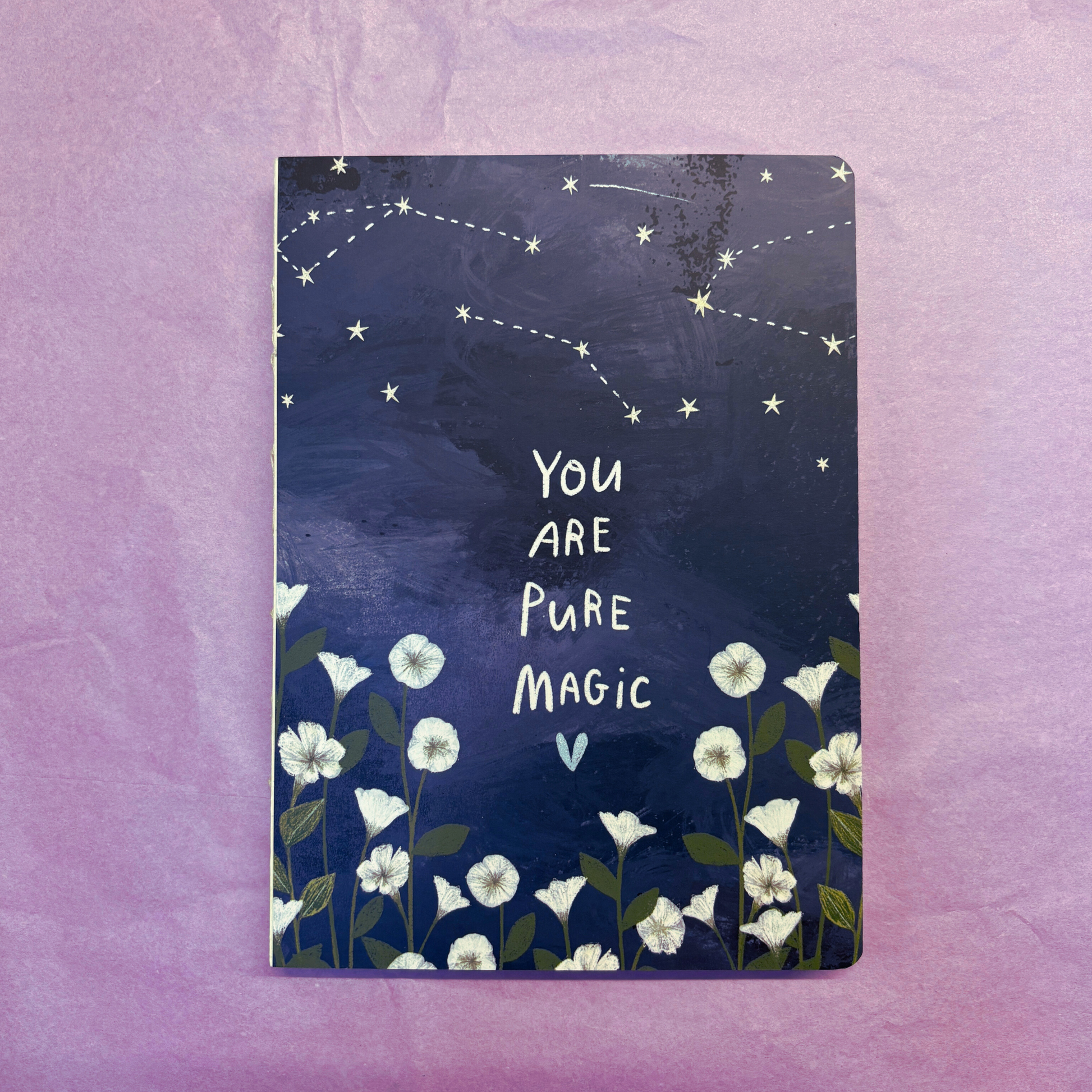 A double-sided notebook featuring constellations and white flowers designs with "You are Pure Magic" sentiment.