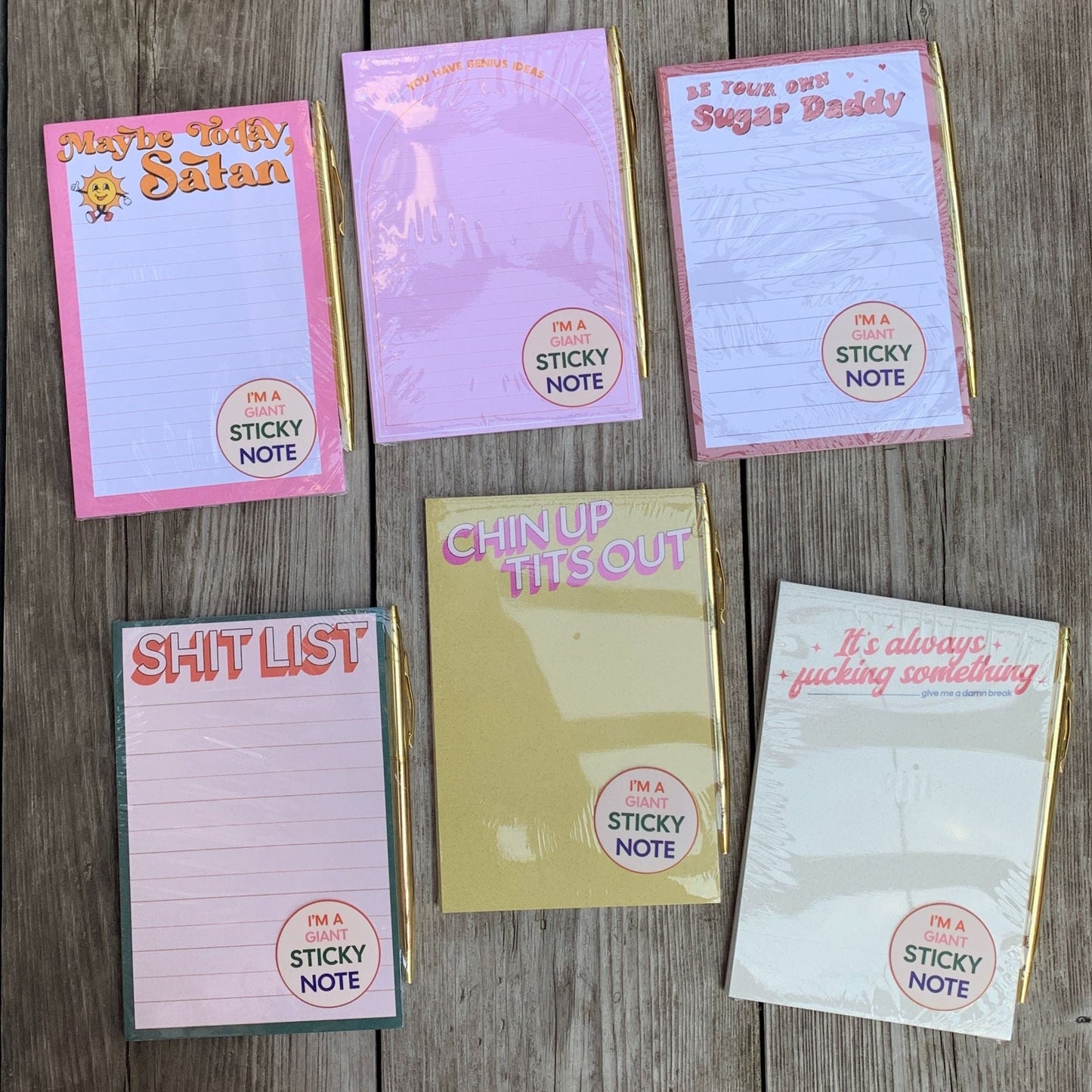 - Gift set is shrink wrapped with sticker saying "I'm a giant sticky note!"