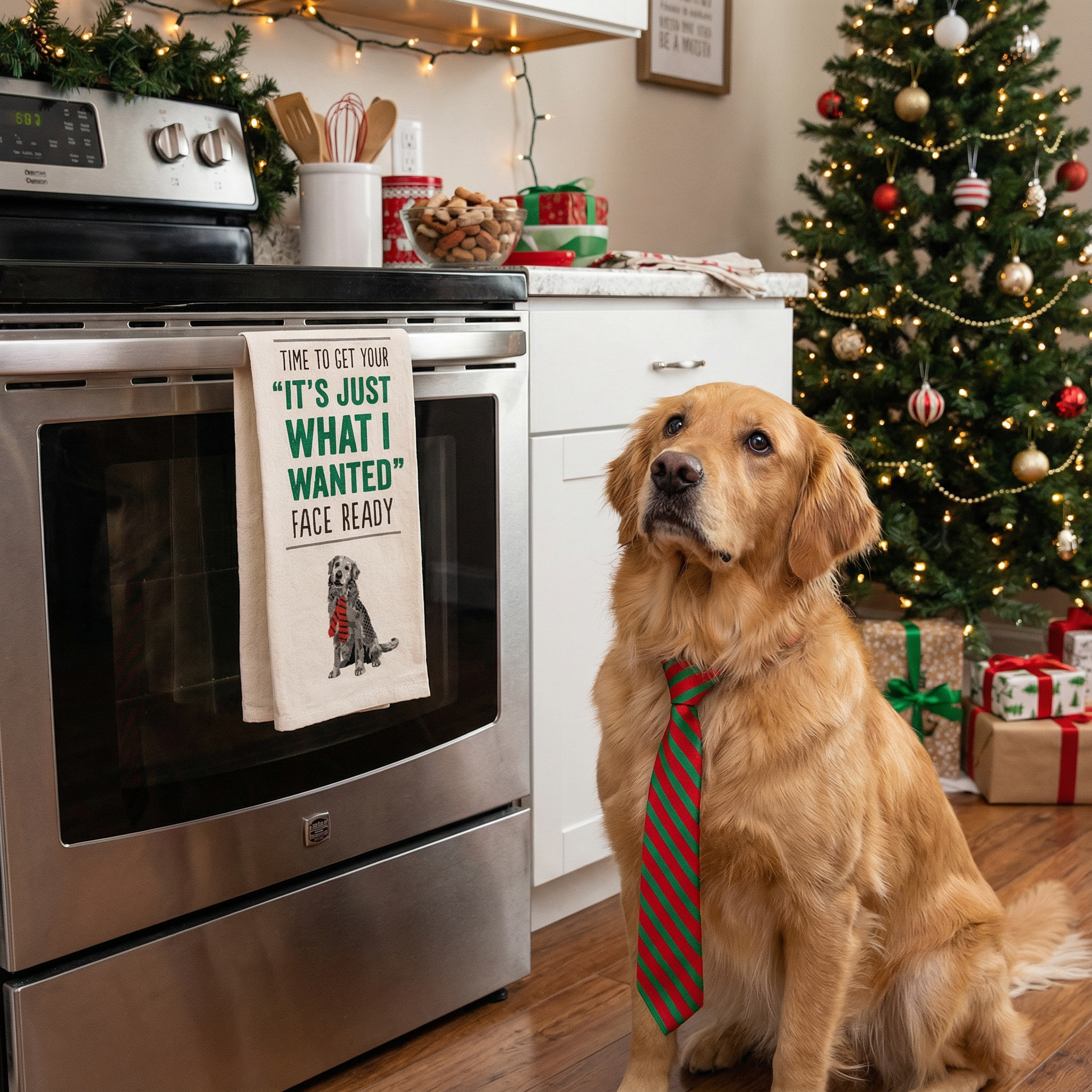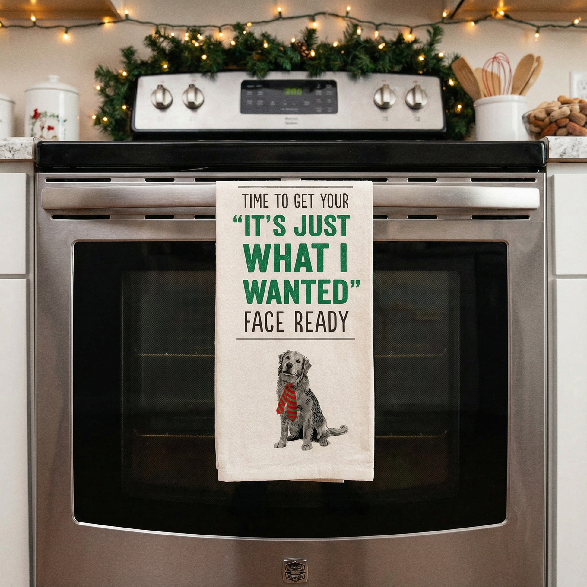 A cotton kitchen towel featuring "Time To Get Your 'It's Just What I Wanted' Face Ready" sentiment with dog design and embroidered tie detail. Machine-washable.