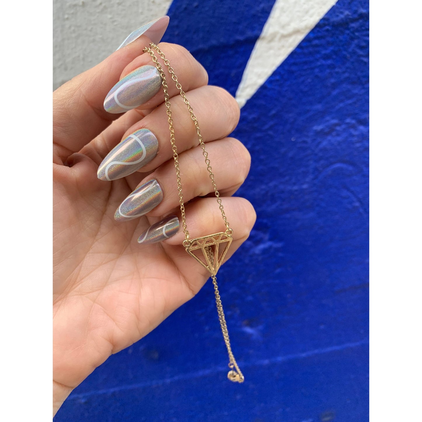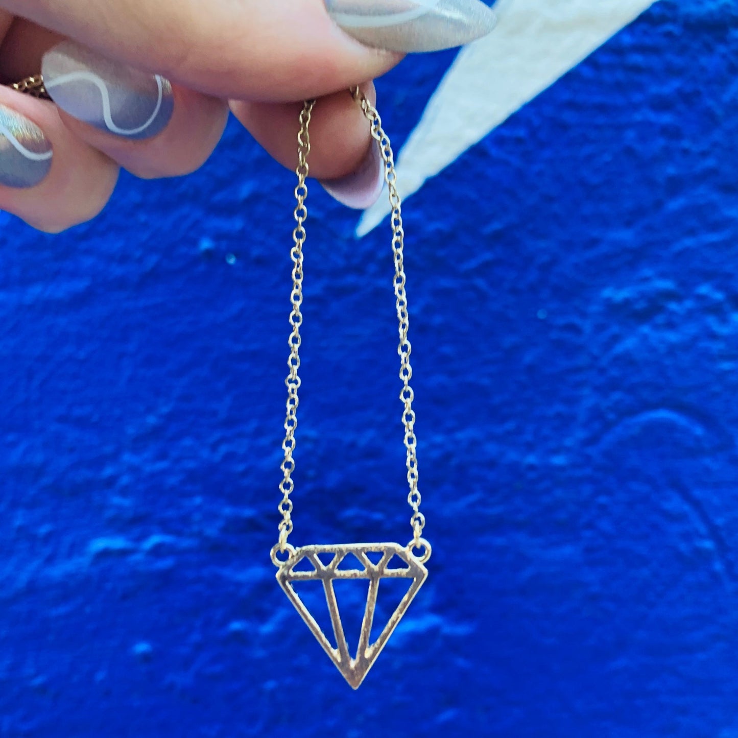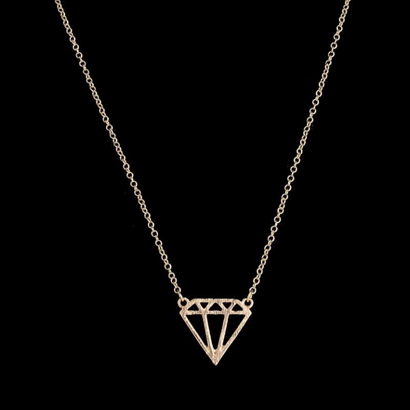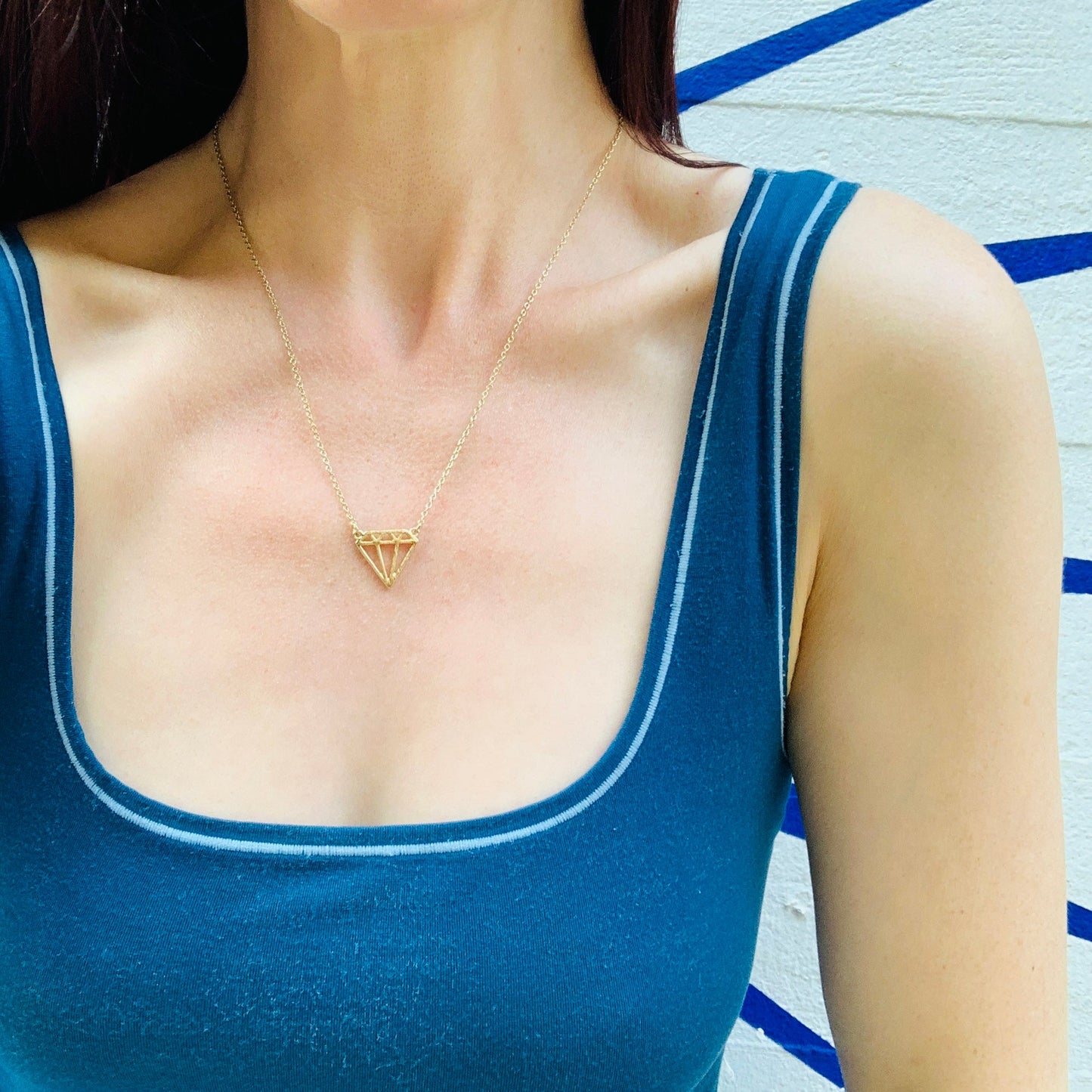 This Gold Openwork necklace features a geometric gemstone design measuring approximately 3/4 inch wide, hanging elegantly on an 18 inch chain. Made of zinc alloy, this unique piece by Paper & Quartz adds a subtle and clever touch to any outfit.